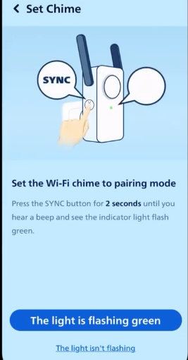 Set the Wi-Fi chime to pairing mode - Press the SYNC button for 2 seconds until you hear a beep and see the indicator flashing green. Then tap on "The light is flashing green" on the app.